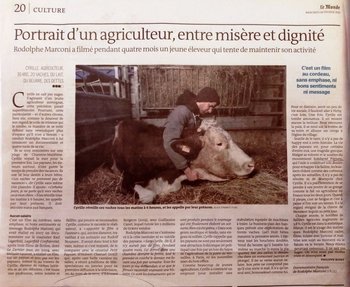 Un article signé par le journal Le Monde, sur le film "Cyrille, 30 ans, 20 vaches, du lait, du beurre, des dettes", sorti le 26 février. Solidarité Paysans en Auvergne a accompagné cet agriculteur.