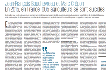 Dans l'édition du journal Le Monde du 25 mars 2021, Jean-François Bouchevreau, président de Solidarité Paysans national, signe une tribune aux côtés de Marc Crépon, philosophe, professeur à l'Ecole normale supérieure, directeur de recherche au CNRS. Ensemble, ils en appellent à la responsabilité du ministre de l'Agriculture quant aux mesures à prendre face aux chiffres alarmants du suicide dans la profession agricole.