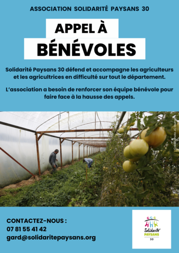 Le réseau Solidarité Paysans a décidé de solliciter ses sympathisants pour intervenir auprès du Ministre de l'Agriculture afin de préserver les capacités d'intervention de l'association auprès des agriculteurs fragilisés ; à l'heure où la crise agricole est massive, profonde et n'épargne aucune filière, aucun modèle de production ; et où le nombre d'exploitations en difficultés ne cesse d'augmenter.