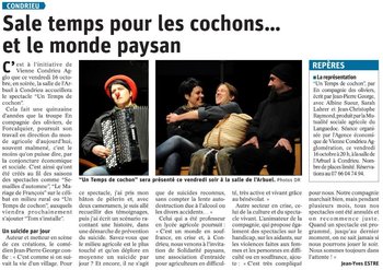 Le journal Le Progrès a publié cet article afin d'annoncer la tenue de la pièce de théâtre "Un temps de cochon" de la troupe de théâtre "En compagnie des oliviers". La soirée a été organisée par Solidarité Paysans Rhône, la MSA et la Communauté d'Agglomération Vienne-Condrieu.