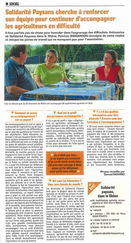 Le journal du syndicat de la Confédération Paysanne du Rhône présente dans cet article l'action l'accompagnement de Solidarité Paysans pour les agriculteurs.rices en difficulté.