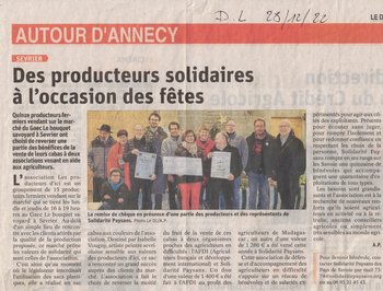 Quel plaisir de voir que la solidarité est bien vivante au sein du monde agricole ; le Dauphiné Libéré nous apprend que le marché de producteurs du GAEC Le Bouquet savoyard a décidé de reverser une partie de ses bénéfices à deux associations de solidarité agricole. L'une, internationale qui est l'AFDI (Agriculteurs Français et Développement International) et l'autre, locale qui est Solidairté Paysans Pays de Savoie.