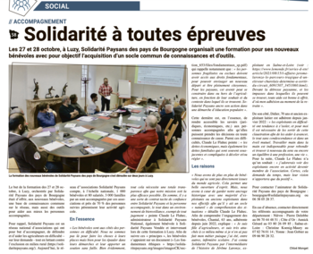 Le 19 et 28 octobre 2022 à Luzy dans la Nièvre (58), Solidarité Paysans des Pays de Bourgogne, avec le soutien et la venue d'administrateurs du réseau national, a organisé une formation sur 2 jours à destination des nouveaux bénévoles de l'association bourguignonne. L'objectif : former les bénévoles aux fondamentaux de Solidarité Paysans, ainsi qu'aux notions essentielles liées à l'accompagnement. Lors de la deuxième journée, une journaliste de Terres de Bourgogne - Nièvre est venue et a pu écrire un artcile sur cette formation dans un numéro du journal. Voici le lien vers l'article en question : /images/imagesCK/section_901/files/article_formation_luzy_dans_terres_de_bourgogne.pdf