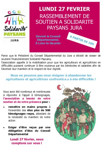 Parce que le Président du Conseil départemental du Jura a arrêté de soutenir financièrement Solidarité Paysans Jura, l'association se mobilise pour que les agriculteurs et agricultrices en difficultés puissent continuer à se défendre afin de favoriser leur maintien.