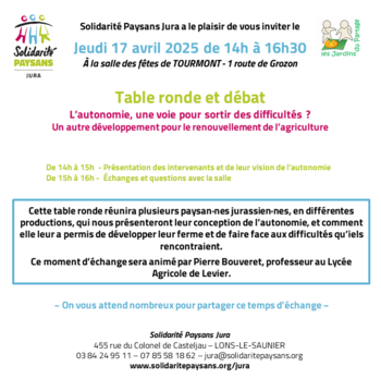 SP Jura a le plaisir de vous inviter à la table ronde qu'elle organise le 17 avril à Tourmont : des paysannes et paysans témoigneront de leurs choix vers plus d'autonomie, et de comment cela a pu les aider face aux difficultés qu'ils rencontraient. On vous attend nombreux !