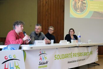 Ploumagoar, le 3 avril 2025 – Derrière chaque ferme en difficulté, il y a des visages, des familles, des histoires. Solidarité Paysans Bretagne a organisé son Assemblée Générale à Ploumagoar (22) pour donner la parole à ceux qui vivent cette réalité au quotidien. Ce jeudi là, ils étaient présents : Maxime, Olivier, Cathy pour raconter leur histoire. Ils ont témoigné, comment ils ont repris leur ferme en main, fait des choix dans un contexte difficile pour que leur projet vive. Ils ont aussi expliqué en quoi l'appui d'un collectif comme Solidarité Paysans a été un levier pour se redresser.